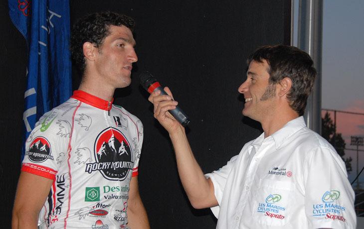 Randy en entrevue d'après-course avec Jean-Michel Lachance aux Mardis cyclistes de Lachine le 26 juillet 2011