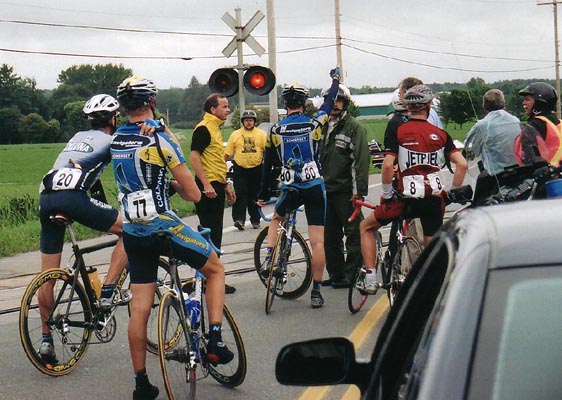 At the train crossing, Jeff Hansen (Atlas Cold/Italpasta) had a gap at the front, with Czeslaw Lukaszewicz (Opus/Élio Pizzeria) and Steve Rover (Opus/Élio Pizzeria) bridging up. The lights of the crossing were flashing, with a police officer standing on the tracks to flag the riders down (apparently the train was stopped, very close to the crossing). Hansen, Lukaszewicz and Rover went by the police officer, with the rest of the break slowing down as they approached the crossing. Thorben Weiditz (Midweek Elite/Thornhill SAAB), Fran?ois Parisien (Espoirs de Laval), Peter Morse (Midweek Elite/Thornhill SAAB) and Sébastien Moquin (Colnago-Carrera) then decided to also cross the tracks, evading the police.
