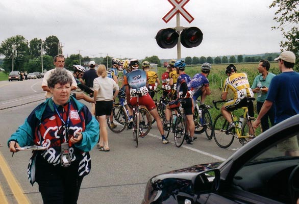 Note: that this situation was a little exceptional in the fact that our break was told nothing of a train crossing before we got to it. It was at the bottom of a hill and we did not even see it until several hundred metres because of the curve of the road and the hill. Seeing as there was a commissaire **right** beside us on a moto the sitution could have been handled a lot better if he gave us some direct instructions to avoid all the confusion.
