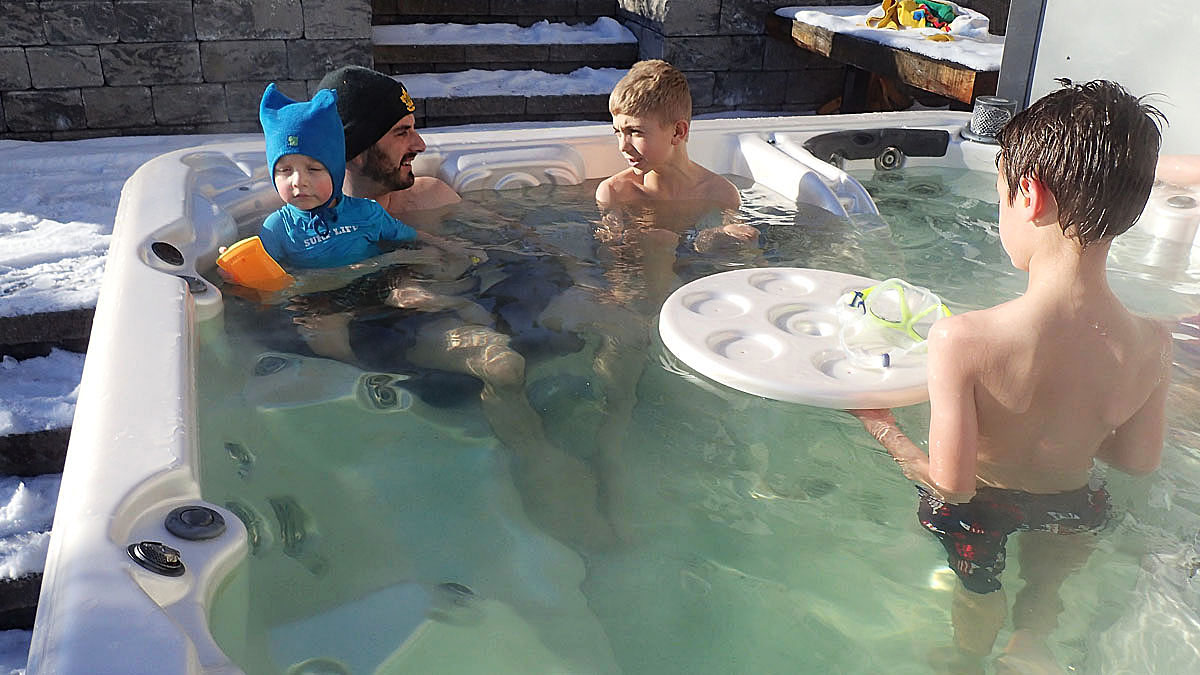 avec papa, Jérémie et Thierry dans le jacuzzi chez tante Stéphanie le 25 décembre