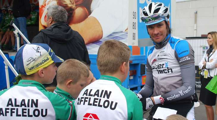 Charly Vivès nous raconte : « Il y avait une ouverture sur la gauche de la route et j'ai kické pour remonter lorsque j'ai vu l'accrochage une dizaine de mètres devant moi. Les 2 freins dans le fond !!! Pas évident de s'arrêter lorsque tu es à 60 km-h (faux plat descendant, vent de dos à 800m de la ligne d'arrivée). J'ai failli éviter la chute mais j'ai manqué de temps. Plongeon vers l'avant qui m'a fait taper fort sur ma crête iliaque gauche. J'ai eu très peur sur le coup pour la hanche (la plaie confirme mon inquiétude... c'était limite !) car je n'arrivais pas à me relever et j'avais la main droite pliée dans la roue d'un coureur d'Europcar qui, par chance, a attendu que je sorte ma main avant de repartir. Le temps que je reprenne mes esprits, je ne pouvais pas repartir car ma roue avant était pliée !!! Vive le carbone :) ».