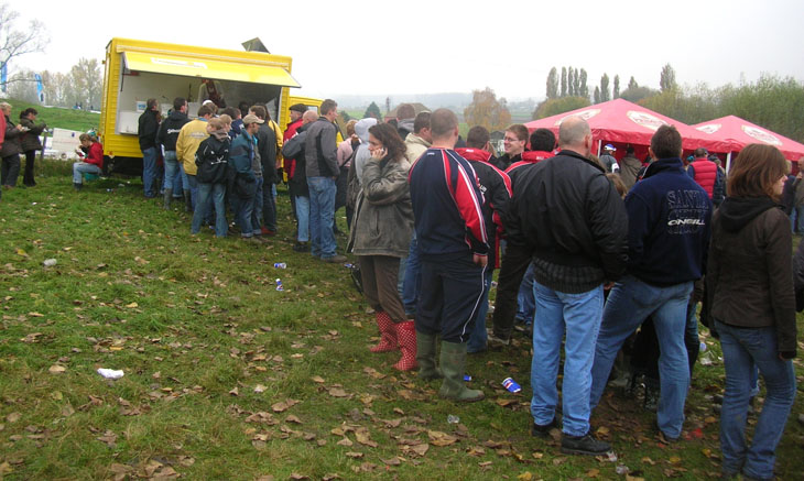 Il n’y a guère plus qu’en Belgique où le vélo est à telle fête chaque hiver. En ce premier novembre je me suis rendu sur les pentes du Koppenberg pour assister à la première manche du Trophée de La Gazet von Antwerpen - du nom d’un quotidien anversois qui est réputé pour ses pages cyclisme à l’année longue. Quelques kilomètres avant le circuit, les voitures, déjà nombreuses dès le matin, sont dirigées vers des parkings géants aménagés dans des pâtures, puis un système de navettes par autobus amène le public à l’entrée du circuit.