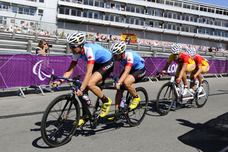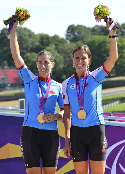 Brands Hatch, 8 septembre 2012 – La pilote québécoise Lyne Bessette et sa coéquipière ontarienne Robbi Weldon ont été les premières à rallier la ligne d’arrivée de la course sur route en tandem, samedi, aux Jeux paralympiques. La paire canadienne s’est imposée avec une avance de 33 secondes sur ses plus proches poursuivantes pour décrocher la médaille d’or sur le circuit de Brands Hatch, dans le Kent.