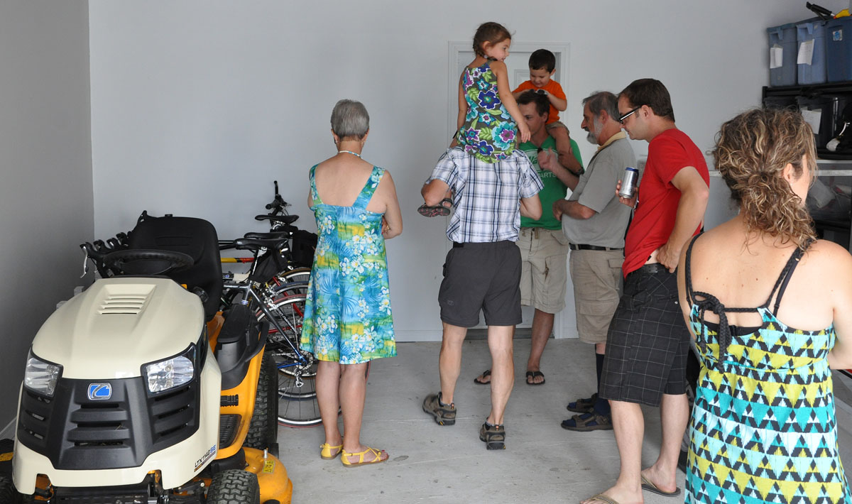 Guy fait visiter son gros garage à Ethel et Marcel, Léa, Benjamin, Lorik, Jonathan et Marie-Ève. Pas aussi gros que celui d´Elvis Gratton mais quand même