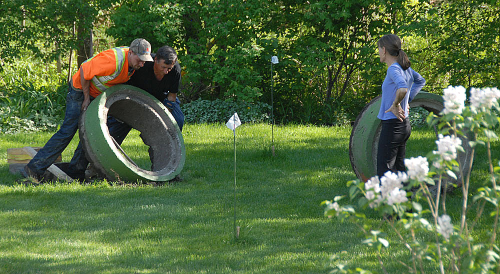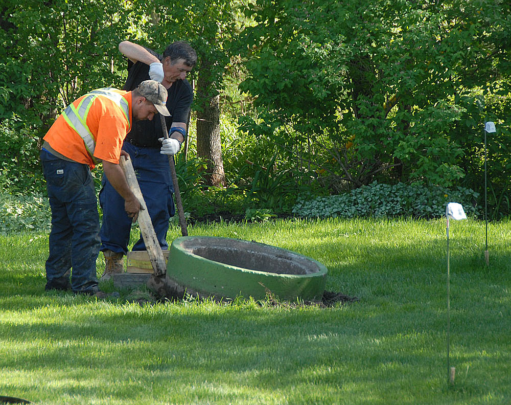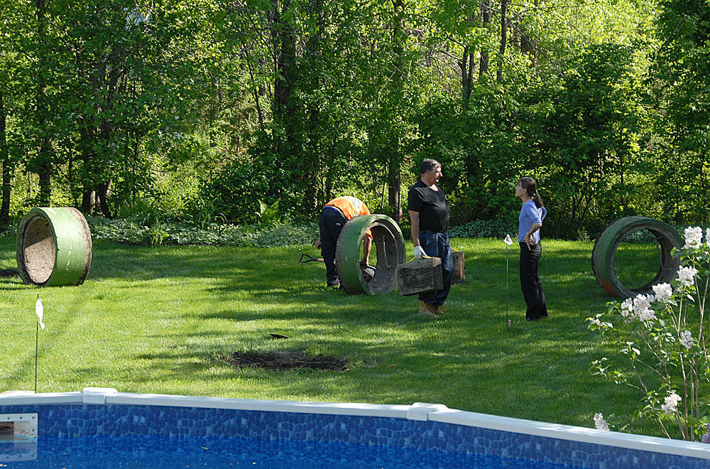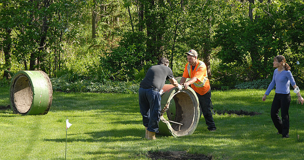 M. Gaétan Hébert et son employé Steven entreprennent de nous débarrasser des tuyaux de ciment en les soulevant, d'abord avec des leviers...