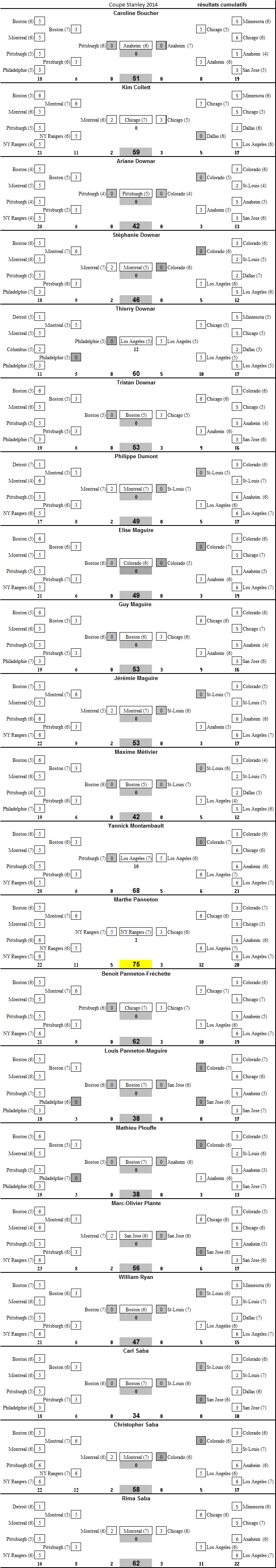 - En finale de la Coupe Stanley, tout est doublé, donc les victoires valent 2 points, 2 points boni pour avoir gagné la Coupe Stanley et 2 points boni si vous avez prédit le bon nombre de parties pour votre équipe gagnante