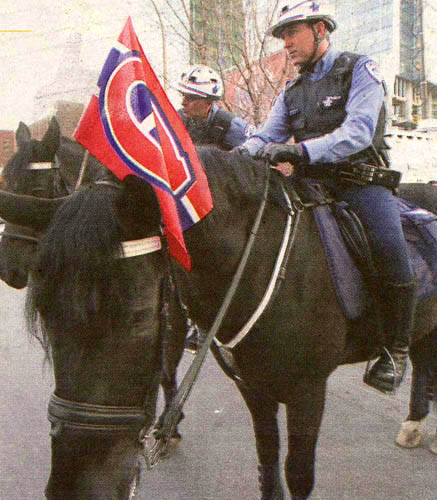 Le SPVM est neutre, me dit Ian Lafrenière et n’endosse pas le CH officiellement. D’ailleurs, les fanions sont censés être retirés, les jours où le Canadien ne joue pas. ni aucune autre « cause », d’ailleurs. Dès que le CH ne sera plus dans les séries, ces fanions disparaîtront…