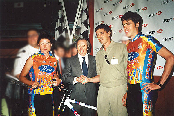 Mélanie, l´ex-champion coureur automobile Jackie Stewart recevant un vélo en cadeau de