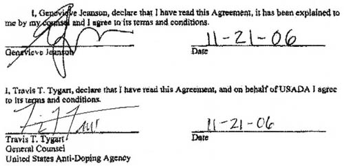 This agreement ("Agreement"), is made as of November 1, 2006 by and between Genevieve Jeanson ("Ms. Jeanson") and the United States Anti-Doping Agency ("USADA"), (collectively the "parties") for the purpose of resolving the charges against Ms. Jeanson as set forth in this Agreement.