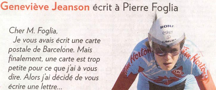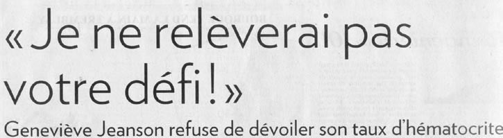 Ma santé, par contre, c'est bien plus important. C'est drôle, il n'y a pas grand monde qui m'a parlé de ma santé. Tout le monde a l'air de penser que quand l'UCI parle d'inaptitude à courir pour des raisons de santé, c'est une joke. Je suis peut-être naïve, mais moi je ne prends pas ça pour une joke. Ma santé, je ne veux pas prendre de chance avec ça. Hématocrite à 49 ou 53, c'est pas ça le problème. Le problème c'est que, à Hamilton, mon hématocrite dépassait la limite de sécurité de l'UCI. Et ça m'inquiète. En fait, depuis deux semaines, c'est la chose qui me préoccupe le plus. Pas le résultat de mon test, ça ne m'a jamais inquiétée. Ça a l'air que j'étais presque la seule personne du Québec qui ne s'énervait pas avec ça.