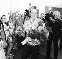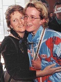 Cyclist Genevieve Jeanson of Lachine got a big hug from her mother, Nicole, when she arrived at Dorval airport yesterday wearing two gold medals from the junior women's world championships in Italy. Last week, Jeanson, 18, won the individual time trial and the road race at Verona. Her next goals: join the national team and compete in the Sydney Olympics.
