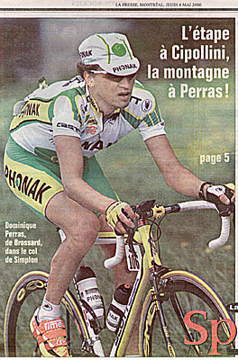 L’animateur du jour fut pourtant «helvétique». Avec guillemets. Canadien de Montréal pas par hasard. «J’ai commencé par jouer au hockey. Jusqu’à l’âge de quinze ans. Mais j’avais des copains qui aimait le cyclotourisme et je me faisais toujours battre. Je me suis entraîné. Et j’ai eu la piqûre du cyclisme.» Belle formule, sans sous-entendus. Néo-professionnel, Dominique Perras atterrit, en début de saison, dans l’équipe suisse Phonak. «L’année passée, la formation de Jean-Jacques Loup a participé au Tour du Transcanada. J’y ai été repéré. Un coup de fil, et me voilà en Suisse.»
