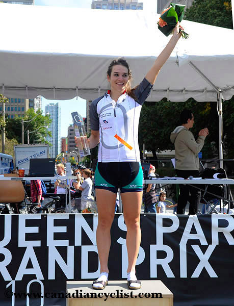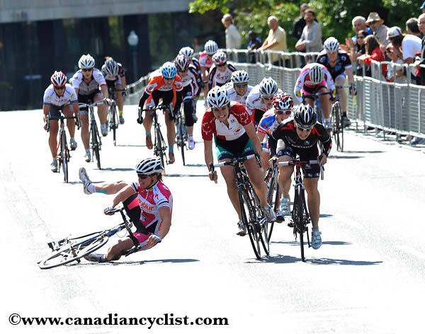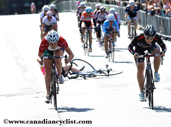 « For the finish, it was Collins, Numainville and Veronique Labonte (Team Nanoblur-Gears) at the front. Collins was leading early in the sprint, but the other two were coming back to her. Collins was gradually drifting towards the center of the road, and all three riders came together, with Labonte going down after making contact with Numainville. Numainville hestitated momentarily, while Collins continued to the line.