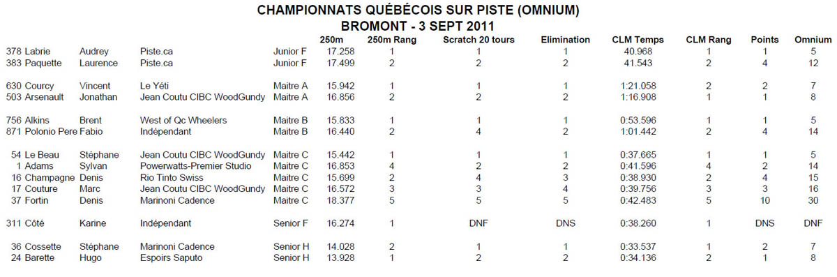 | Les Championnats québécois sur piste Bromont, 3 septembre 2011 |
