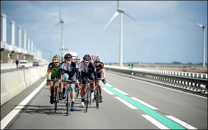 « Ce matin à Rotterdam: les arbres sont couchés, les égouts débordent et on se croirait en novembre. Première ètape de la nouvelle course ASO, World Port Classic 2.1. »
