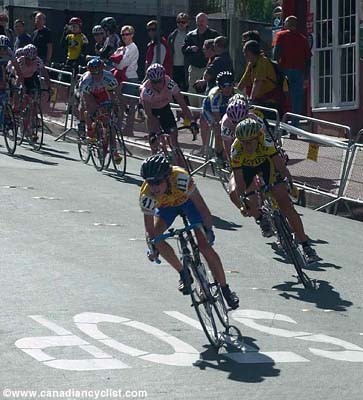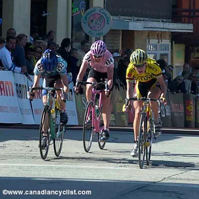 Saturn blew all its fuses keeping up the pressure on RONA. Attack after attack decimated the field and brought the number of riders remaining in the pack to just 17 riders. When a break of three went off in the final remaining laps, Saturn rider Arnt was there. But when it came down to the final sprint, she was outmatched by Berger (Cannondale) and DeMars (Bianchi). Jeanson and Bessette brought the field home.
