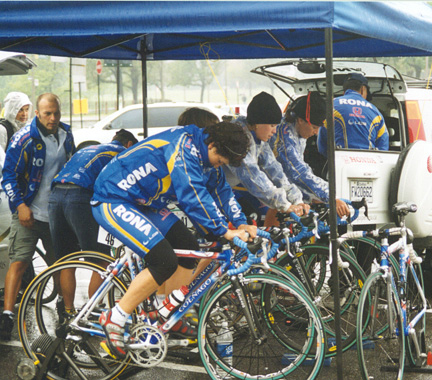 L'équipe RONA se réchauffe à l'abri de la pluie