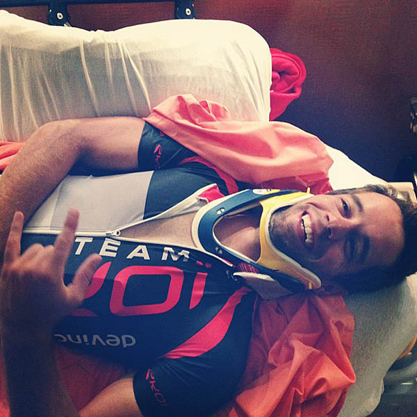 Jean-François Laroche a également été impliqué dans cette chute de plusieurs cyclistes. À John Symon qui lui demandait des nouvelles il a répondu :
