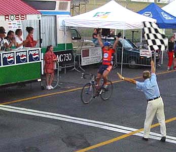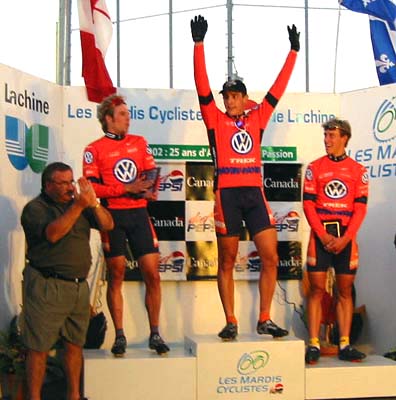 (Lachine, le 23 juillet 2002) La formation Volkswagen-Trek s'est une fois de plus illustrée ce soir aux Mardis cyclistes de Lachine en montant sur les trois marches du podium. Pascal Choquette a franchi le premier le fil d'arrivée, suivi de ses coéquipiers Martin Nuckle et Martin Gilbert. La troisième position de Gilbert lui permet de conserver son maillot jaune de meneur et de creuser davantage l'écart le séparant de son plus proche poursuivant au classement général, Yannick Cojan.