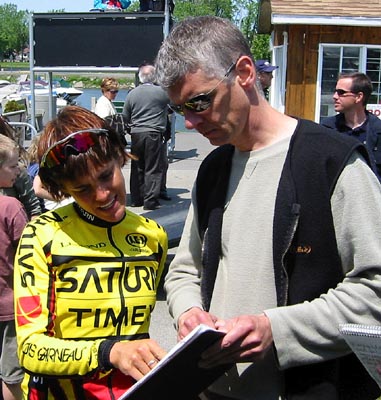 Manon Jutras vérifie les temps auprès de l'annonceur Louis Bertrand