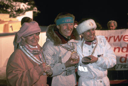 Podium du 15km en biathlon aux J.O. d'Albertville le 19 février 1992. De g. à dr. Svetlana Pecherskaya, (ex-URSS), 2e, l'Allemande Antje Harvey et Myriam Bédard, 3e. photo : Vandystadt, Getty Images