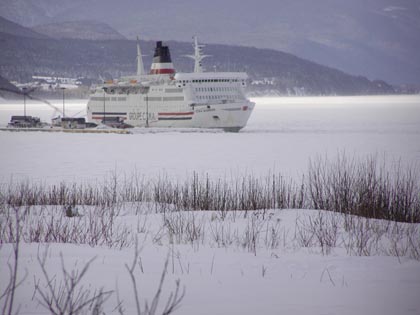 Accosté au quai de Sandy Beach aux petites heures du matin, le CTMA Vacancier a été enveloppé dans une tempête de neige jusqu'en fin de matinée avec un vent suffisamment violent pour qu'on choisisse de transférer en autobus les fondeurs sur le petit kilomètre les séparant du début de la piste cyclable, transformée pour l'occasion en piste de ski et menant à la page de Haldimand.