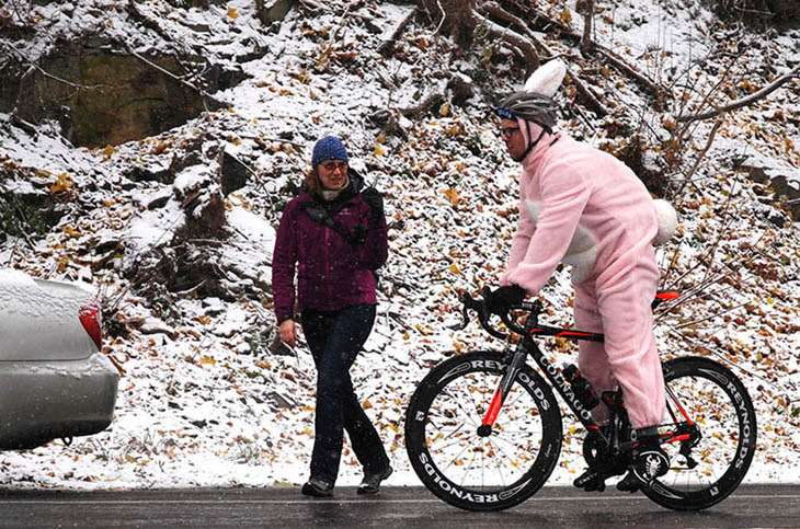 I pointed out that not only did Georges not stand a chance, but that I could also beat him, even while carrying an extra 20lbs of sugar on my back AND a pink bunny suit. Since I did not have 20lbs of sugar, I had a knapsack with a 12lb Kurt Kinetic Pro trainer flywheel, a 4lb bag of quinoa and a 5lb leg weight. I wore the knapsack under my rabbit suit.