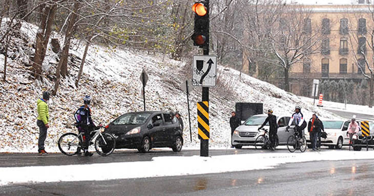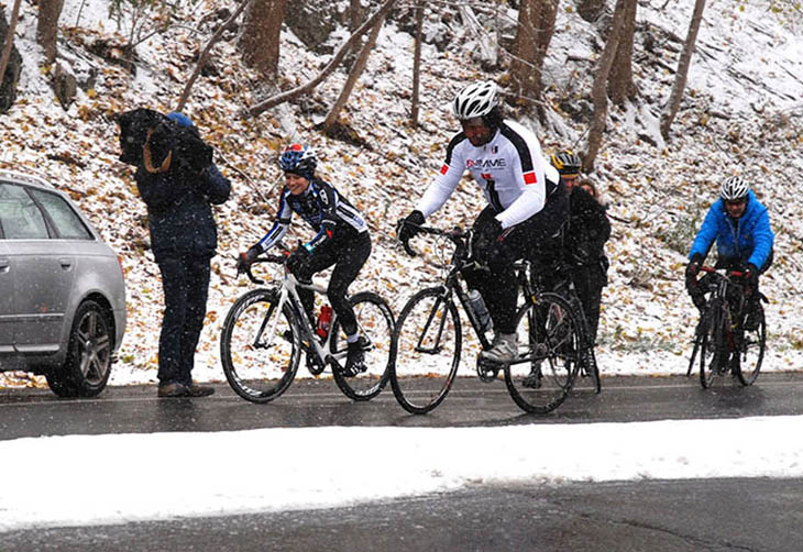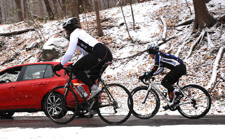 Laraque now participates in marathons and half-marathons, so it wasn’t 100% clear how this would go, although I suspected Lex would easily take him. There were 10 of us on bikes following the riders along with a full caravan of vehicles on the snow-dusted asphalt.