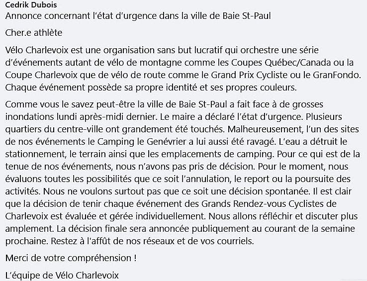 La décision de tenir les Grands Rendez-vous Cyclistes de Charlevoix