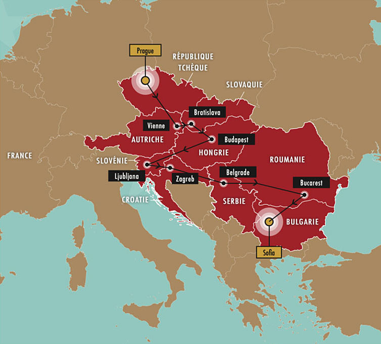 Après Lisbonne-Dunkerque en 2019, et Dunkerque-Stockholm en 2022, voici Prague-Sofia. les capitales du voyage : Vienne, Bratislava, Budapest, Ljubljana, Zagreb, Belgrade, Bucarest et Sofia. Environ 2 700 km (24 étapes de 118 km/jour).