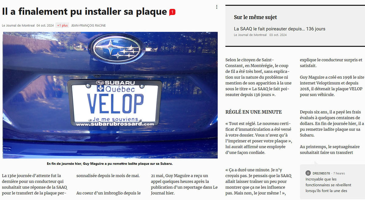 Le 21 mai 2024 le webmestre est allé dans un bureau de la SAAQ pour faire transférer sa plaque personnalisée sur son nouveau véhicule.