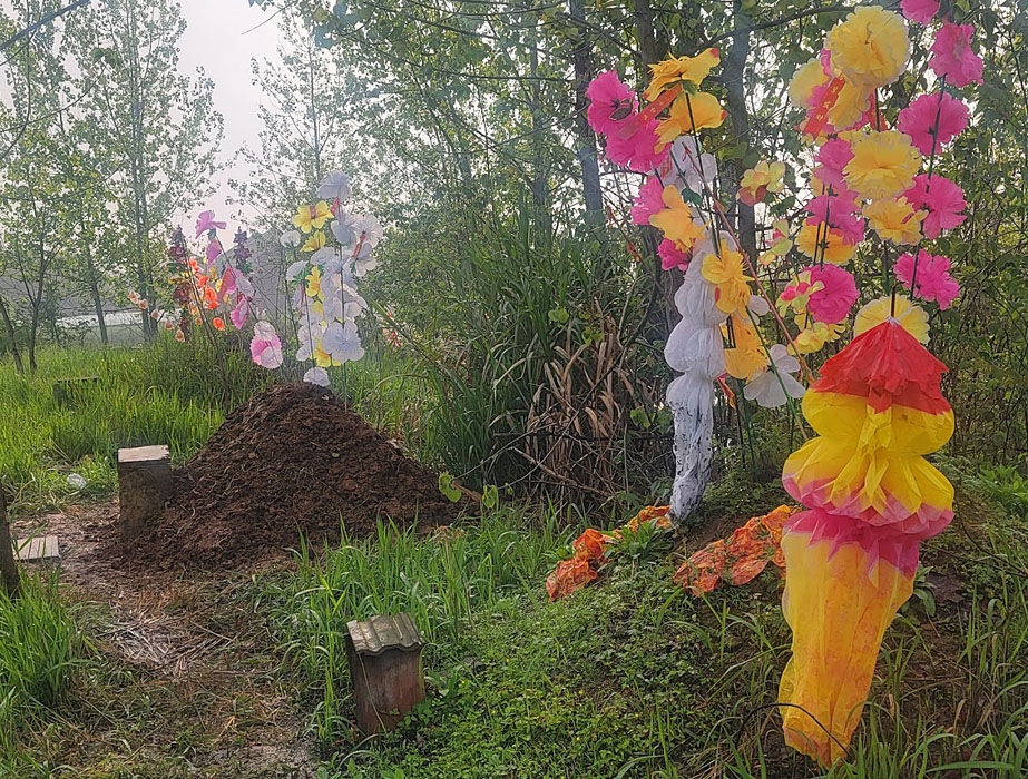 On voit souvent des rangées de fleurs, disséminées un peu partout dans la clairière. Notre guide, Bai, m'explique qu'à la Pâques on fête les ancêtres et la mémoire des morts par ces arrangements.