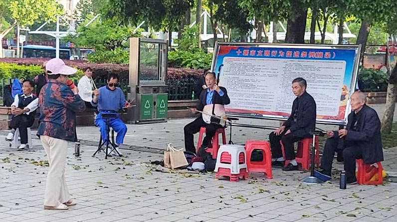 J'arrive à Shiyan où se déroule un karaoké sur une grande place.