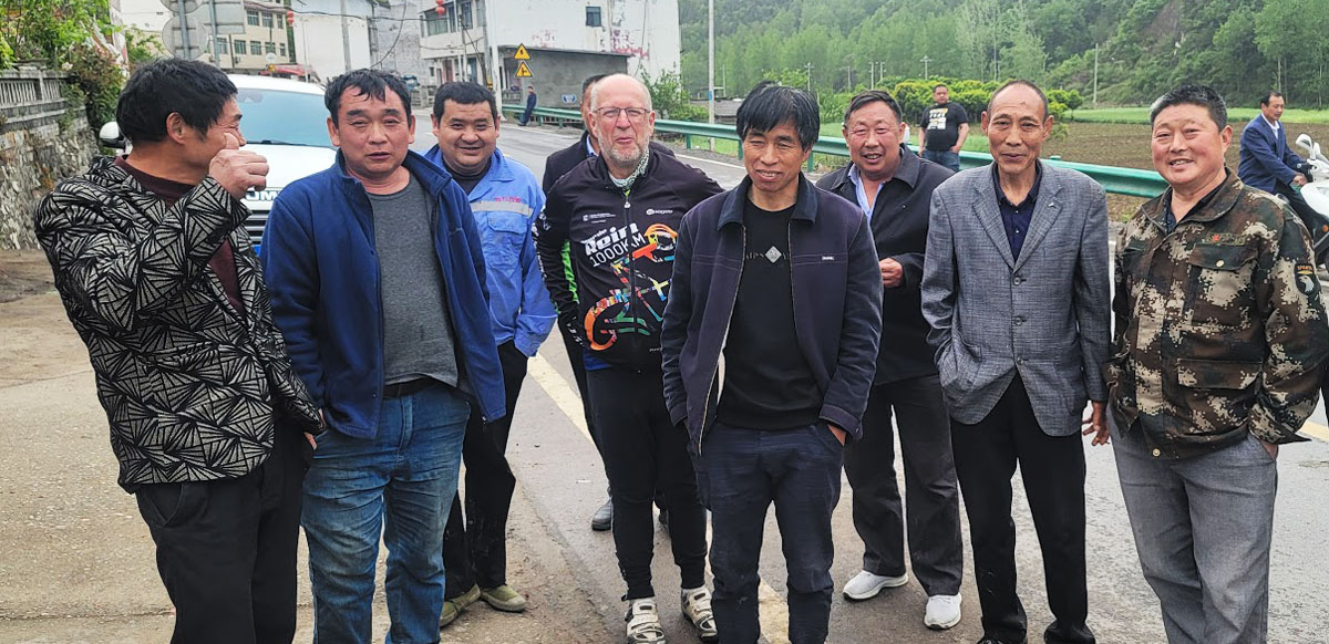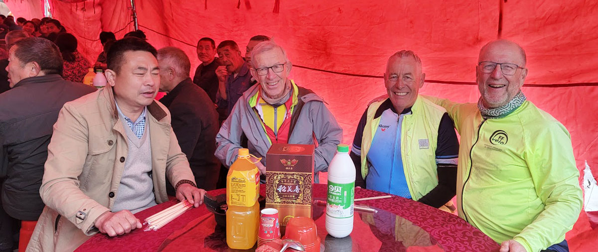 Nous entrons maintenant dans un nouvelle province, le Shannxi. Vous vous souvenez que l'an passé j'avais été invité à un mariage. Eh bien cette fois-ci c'est Christian qui, voyant un attroupement, y jette un oeil et s'y fait inviter. Il s'agit de funérailles. Il est coutume en Chine de célébrer la vie de la personne décédée. Les personnes proches portent un brassard blanc. Eh bien nous avons été submergés de nourriture et sommes devenus les convives de la journée. Et il faut faire cul-sec avec un alcool de riz, ce que je fis. Après une bonne heure nous avons dû quitter... entourés de supporters.