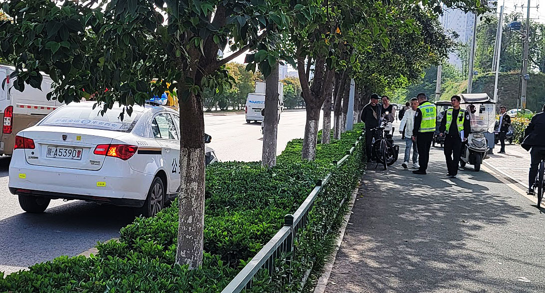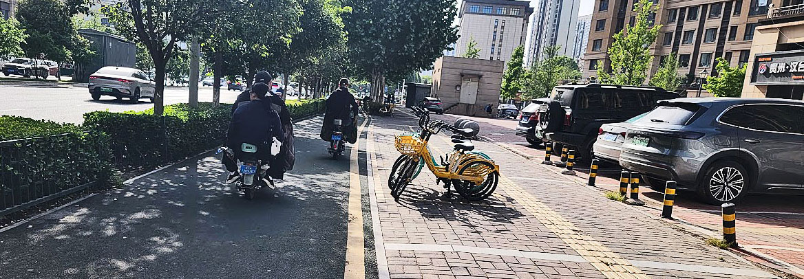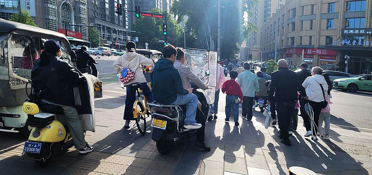 Arrivée en ville à Xian. Ordonnancement : la route des voitures, celle des vélos et quadrimoteurs électriques, les espaces de stationnement vélos, les trottoirs pour piétons puis les espaces de stationnements voitures... mais que c'est habilement planifié !